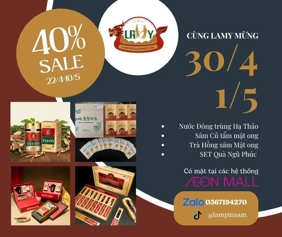 Hòa chung không khí hân hoan của cả nước hướng tới kỷ niệm Ngày Giải phóng miền Nam 30/4 và Quốc tế Lao động 1/5 – những dịp lễ trọng đại mang ý nghĩa lịch sử sâu sắc, Công ty Cổ phần Phát triển LAMY xin trân trọng gửi lời tri ân tới quý khách hàng bằng chương trình khuyến mãi vô cùng hấp dẫn: Giảm giá đến 40% cho các dòng sản phẩm sâm và nấm Hàn Quốc chính hãng tại gian hàng LAMY trong hệ thống siêu thị AEON MALL trên toàn quốc.