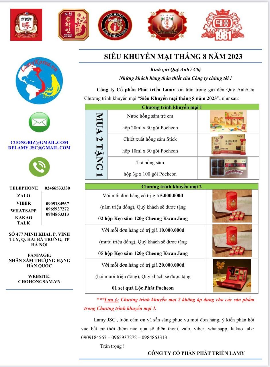 Cảm ơn bạn đã tin tưởng và ủng hộ sản phẩm Sâm, nấm linh chi Hàn Quốc của LAMY. Chúng tôi vẫn còn rất nhiều ưu đãi, khuyến mại trong tháng 8 và thời gian tới. Hãy tiếp tục theo dõi các kênh online của LAMY để luôn được cập nhật những thông tin mới nhất và nhận thêm nhiều ưu đãi hấp dẫn.