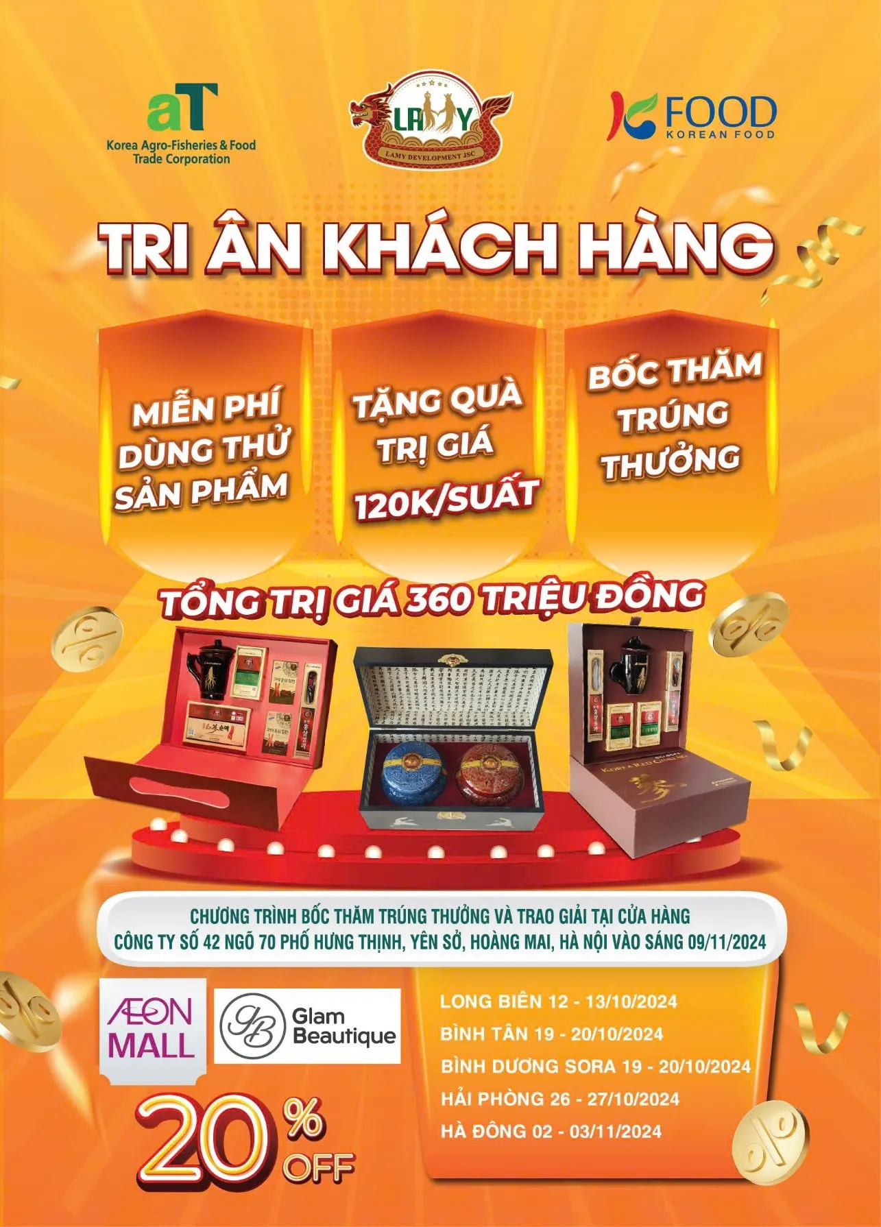 Sự kiện kéo dài trong hai ngày, khách hàng không chỉ được trải nghiệm các sản phẩm sâm nấm Hàn Quốc nổi bật như sâm lát, kẹo sâm, nước hồng sâm linh chi mà còn nhận những món quà tặng miễn phí từ ban tổ chức. Điều này không chỉ thể hiện sự tri ân mà còn khẳng định cam kết của Lamy trong việc mang đến giá trị sức khỏe cho người tiêu dùng.